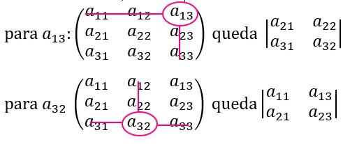 de donde los cofactores asociados son, \begin{align} &C_{13}=\left(-1\right)^{1+3}\left|\begin{matrix}a_{21}&a_{22}\\a_{31}&a_{32}\\\end{matrix}\right|=\left|\begin{matrix}a_{21}&a_{22}\\a_{31}&a_{32}\\\end{matrix}\right|\\ &C_{32}=\left(-1\right)^{3+2}\left|\begin{matrix}a_{11}&a_{13}\\a_{21}&a_{23}\\\end{matrix}\right|=-\left|\begin{matrix}a_{11}&a_{13}\\a_{21}&a_{23}\\\end{matrix}\right|\end{align}